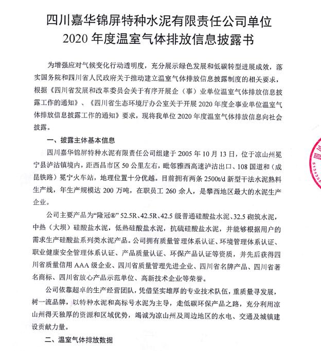 四川嘉华锦屏特种水泥有限责任公司2020年度排放报告